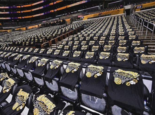 湖人新赛季的主场揭幕战,为球迷送上定制T恤,全都放在座位上,前面印着湖人队的logo,背面则印有新赛季的完整赛程。